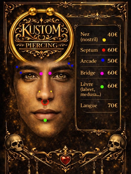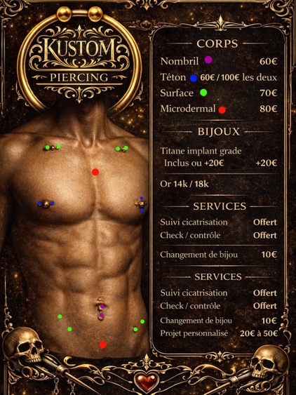 Réalisés avec des matériaux haut de gamme comme le titane implantable ou l'or 14k et 18k, les piercings s'inscrivent dans une démarche professionnelle, sécurisée et durable. L'accompagnement personnalisé, du conseil au suivi, garantit une expérience de qualité à chaque étape.